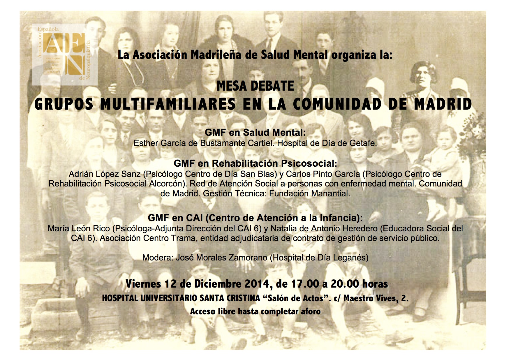 El próximo viernes 12 de diciembre de 17:00 a 20:00 vamos a celebrar un encuentro para poder reflexionar y dialogar sobre los grupos multifamiliares que se llevan a cabo en la práctica clínica en distintos escenarios asistenciales como la atención a la infancia, la rehabilitación psicosocial o servicios de la red de salud mental. El formato será una mesa-debate en la que participarán profesionales con experiencia clínica en la conducción de estos grupos y nos reuniremos en el Salón de Actos del Hospital Universitario Santa Cristina (C/Amadeo Vives, 2). Nos vemos allí!