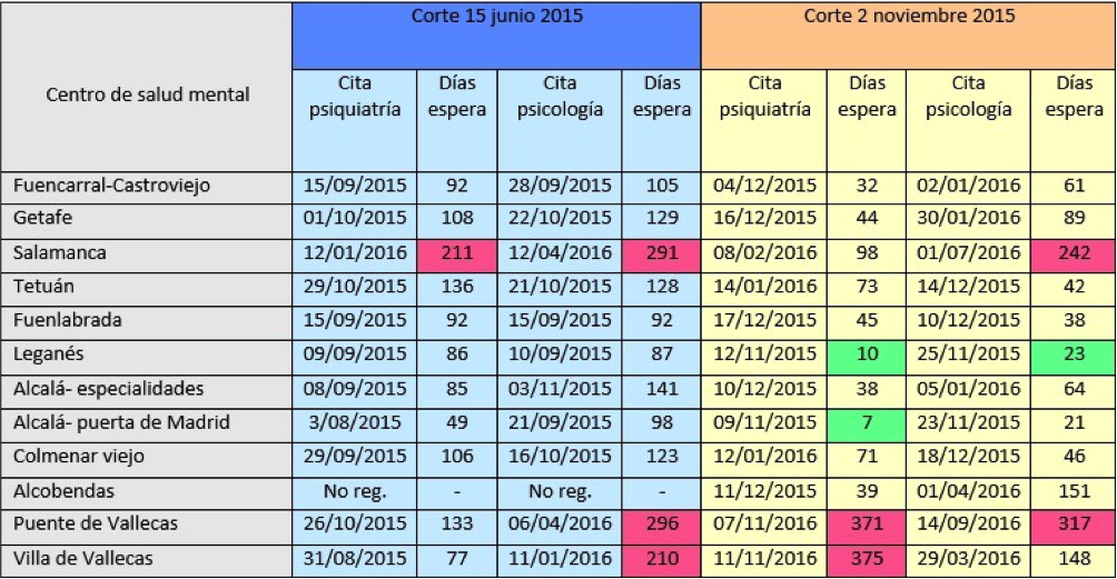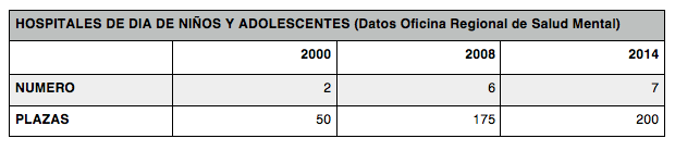 - Datos de la Red de Salud Mental de la Consejería de Sanidad. Hemos solicitado en diferentes ocasiones datos a los responsables de la Oficina Regional de Salud Mental o a los sucesivos Directores Generales y no se nos han proporcionado. Los últimos datos oficiales son de 2008 y aparecen publicados en el Plan Estratégico de Salud Mental 2010-2014. Además estos datos presentaban importantes omisiones (como el numero de profesionales de los servicios hospitalarios, de las unidades de media y larga estancia o recursos concertados) y otros datos aparecen agregados de tal manera que no reflejan la realidad de los servicios (por ejemplo no se diferencian profesionales de los equipos de infantil de adultos o aparecen de forma conjunta los profesionales de hospitales de día y centros de salud Mental).