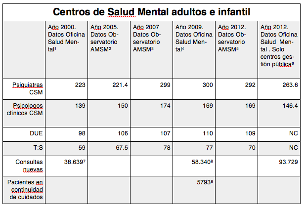 1 Plan de Salud Mental de la Comunidad de Madrid 2003-2008. Se han descontado los profesionales de los Hospitales de Día. 2 Publicado en: Observatorio de Salud Mental de Madrid. Boletín de la AMSM. Número Extraordinario Primavera 2006. 3 Publicado en: Boletín AMSM. Otoño 2008. 4 Datos facilitados por la Oficina Regional de Salud Mental. Sin Publicar. 5 Datos Recogidos por el Observatorio de Salud Mental de la AMSM. Sin publicar. 6 Datos elaborados por la Oficina Regional de Salud Mental. Sin publicar. No incluyen los profesionales de los SSM de gestión privada en 2012: Arganzuela, Moncloa, Valdemoro, Aranjuez y Torrejón. 7No se incluyen los distritos de Tetuan, Chamberí y Usera. 8Datos de 2007. Memoria de actividad de 2007. Publicado en el Plan Estratégico de Salud Mental 2010-2014