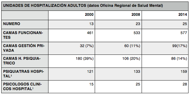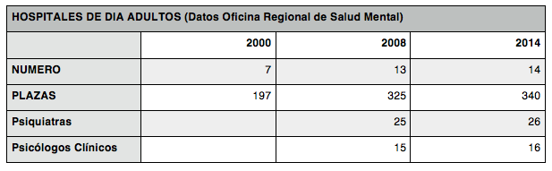 - En estos 14 años analizados la disponibilidad de datos oficiales de los recursos y actividad de los Servicios de Salud Mental ha empeorado ostensiblemente. Desde el año 2008 no existen memorias de la Oficina Regional de Salud Mental y no sean hecho evaluaciones de los dos planes de salud mental que han existido. Por el contrario los datos de la Red Publica de Atención Social para Personas con Enfermedad Mental Grave y Duradera, dependiente de la Consejería de Políticas Sociales son accesibles y se publican anualmente. Esto es un indicador de la perdida de función de planificación y evaluación de la Oficina Regional de Salud Mental y del fracaso de la forma en que se hizo la adscripción de los recursos de salud mental a las gerencias hospitalarias.