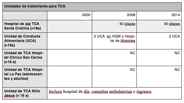 El impacto social y mediático de los problemas de conducta alimentaria hizo que en Febrero de 2007 se firmara “El Pacto Social contra la anorexia y la bulimia” y se destinaran importantes recursos para atender estos problemas en la etapa final del Plan de Salud Mental 2003-2008. Así se crearon dos unidades de atención ambulatoria en el Gregorio Marañon y en el Hospital de Mostoles para mayores de 16 años y un hospital de día en el Hospital Santa Cristina para mayores de 18 años y se reforzaron los programas del Hospital Niño Jesus y de La Paz. Este crecimiento de recursos sin embargo se hizo sin un plan estratégico conjunto dejando algunos problemas: