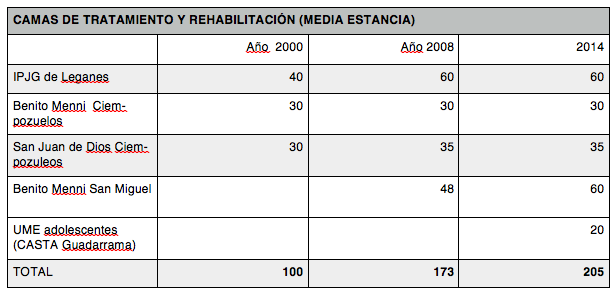 - En 2015 se abrió una Unidad de Media Estancia concertada para adolescentes en Guadarrama con 20 camas. Es un dispositivo ubicado en un Centro Psiquiátrico, alejado del entorno del adolescente y de difícil accesibilidad para muchas familias.