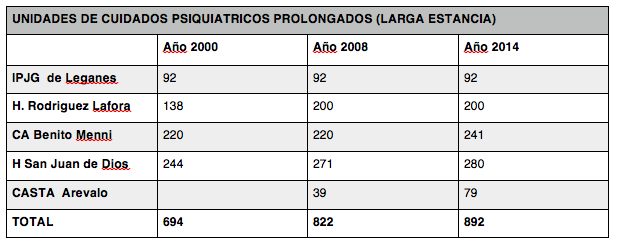 - El numero de camas para hospitalizaciones prolongadas en centros psiquiátricos (media y larga estancia) se han incrementado pasando de alrededor de 800 camas en el año 2000 a unas 1100 en el año 2014. A estos datos hay que añadir que hay más de 50 personas tutelas por la Agencia Madrileña del Adulto (AMTA) en instituciones psiquiátricas fuera de la Comunidad de Madrid.