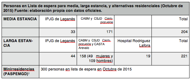 - En Octubre de 2015 había alrededor de 425 personas en lista de espera para unidades de media y larga estancia. A esto hay que sumar unas 300 personas en lista de espera para Minirresidencias. Estas cifras hay que valorarlas con cautela: en ocasiones no todas las personas en lista de espera acaban ingresando; algunas personas están ya en algún recurso esperando otro y otras pueden estar en dos listas a la vez.