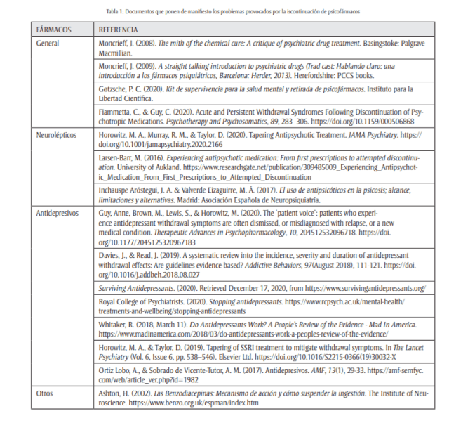 Horowitz, 2020; Horowitz & Taylor, 2019; Ortiz Lobo & Sobrado de Vicente-Tutor, 2017; Whitaker, 2018) y otros fármacos (Ashton, 2002; Azparren & I. García, 2014; Gøtzsche, 2020) a través de trabajos que han sido realizados tanto por quienes los han experimentado personalmente (Hall, 2007; Surviving Antidepressants, 2020) como por profesionales (Gøtzsche, 2020).