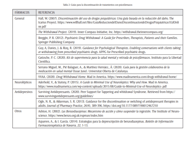 Los conocimientos acumulados sobre los efectos de la discontinuación de psicofármacos pueden ser utilizados para construir guías que permitan que, cuando ésta vaya a llevarse a cabo, se haga con el menor riesgo posible. Hoy disponemos de guías elaboradas por profesionales, por personas que han pasado personalmente por procesos de discontinuación y por grupos en los que han trabajado conjuntamente unos y otros. Hay guías dirigidas a prescriptores, a los usuarios o a profesionales no prescriptores o personas legas dispuestas a acompañar a quienes han tomado la determinación de interrumpir la toma de medicación psiquiátrica. Hay que tener en cuenta que la prescripción está siempre firmada por un médico porque la legislación así lo exige, pero la demanda que la motiva frecuentemente proviene de otros profesionales que participan el proceso de atención, o de familiares, amigos o miembros de la red social de la persona que se medica muchas veces bajo una fuerte presión social frecuentemente recogida en los medios de comunicación. Por eso la responsabilidad en la deprescripción debe ser compartida por todos estos agentes (Meneu de Guillerna & Márquez, 2007). La tabla 2 recoge una selección de estas guías.
