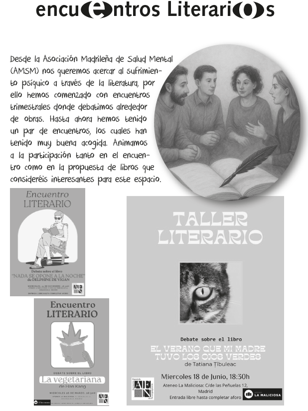 Desde la Asociación Madrileña de Salud Mental (AMSM) nos queremos acercar al sufrimiento psíquico a través de la literatura, por ello hemos comenzado con encuentros literarios trimestrales donde debatimos alrededor de obras. Hasta ahora hemos tenido 3 encuentros, los cuales han tenido muy buena acogida.